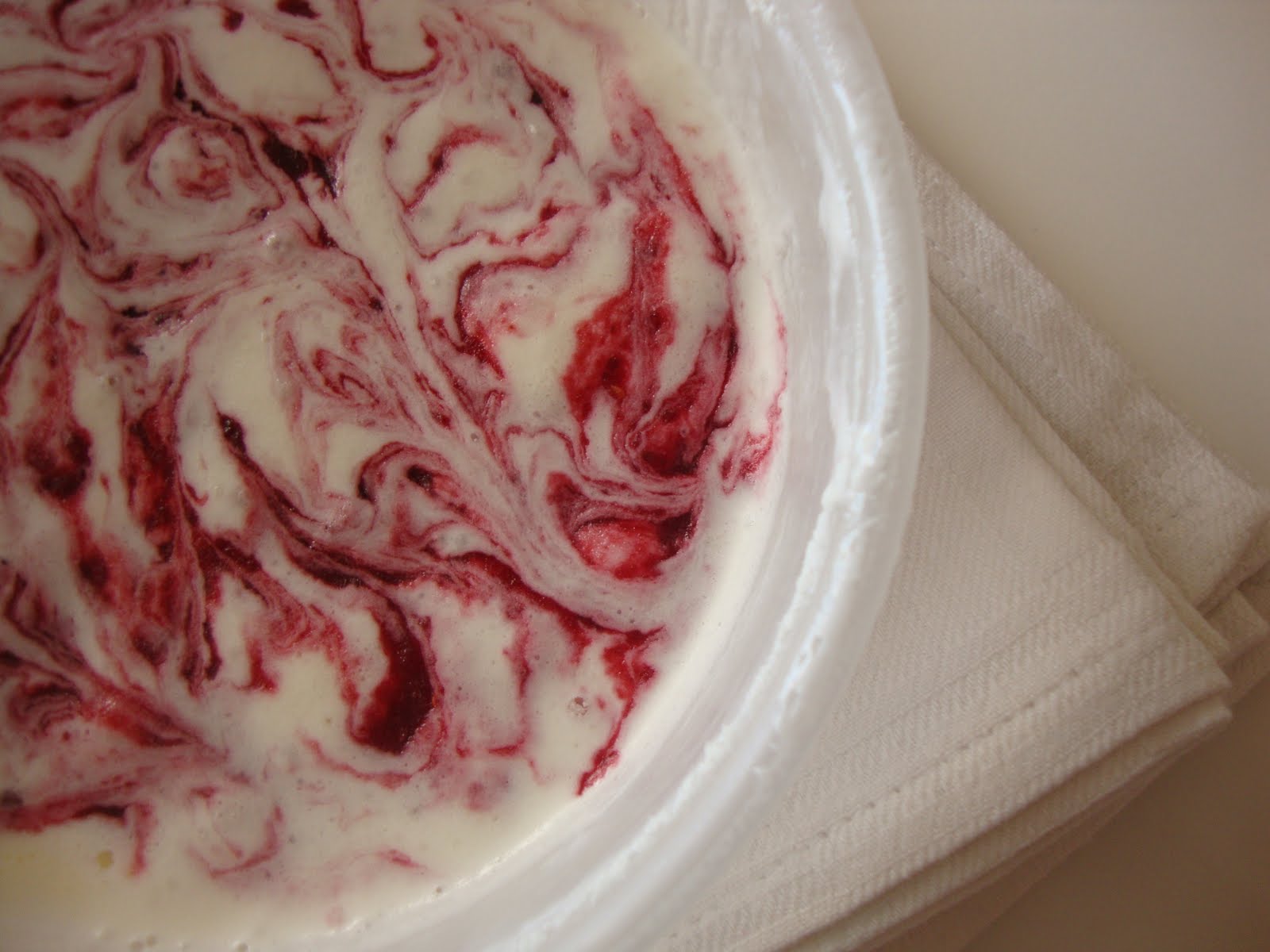 Ao fim desse tempo retire as natas do congelador, misture-as novamente com a ajuda de um garfo e cuidadosamente deite colheradas da calda de frutos silvestres sobre as natas. Com a ajuda de um espeto de madeira ou a ponta de uma faca faça movimentos circulares de modo a criar o efeito marmoreado, mas sem misturar em demasia as duas misturas.