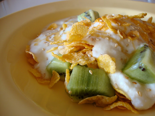 4 colheres de sopa de cornflakes (podem usar outro tipo de cereais/muesli, mas curiosamente os cornflakes são os cereais com menos açúcar e gordura do mercado - menos até que os ditos de "dieta")