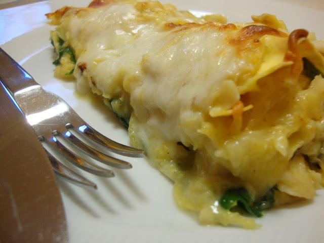 Andava há imenso tempo para fazer uma lasanha de bacalhau com caril, que já me tinham dito ficar muito saborosa. No dia em que me decidi a fazê-la, tinha um resto de espinafres frescos para acabar e uns camarões a precisarem de ser comidos. Quando dei por mim já tinha decidido juntar tudo numa só lasanha.