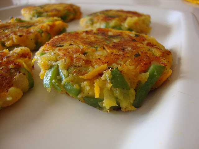 Entretanto escorra as batatas e esmague-as com um garfo ou com um instrumento próprio como um passe-vite. Junte os legumes ao puré de batata e rectifique de sal e pimenta, temperando depois com um pouco de noz moscada e com a salsa picada. Deixe arrefecer um pouco, e assim que conseguir molde pequenos bolinhos, como se fossem hamburguers. Coloque-os no frigorífico para ficarem firmes.