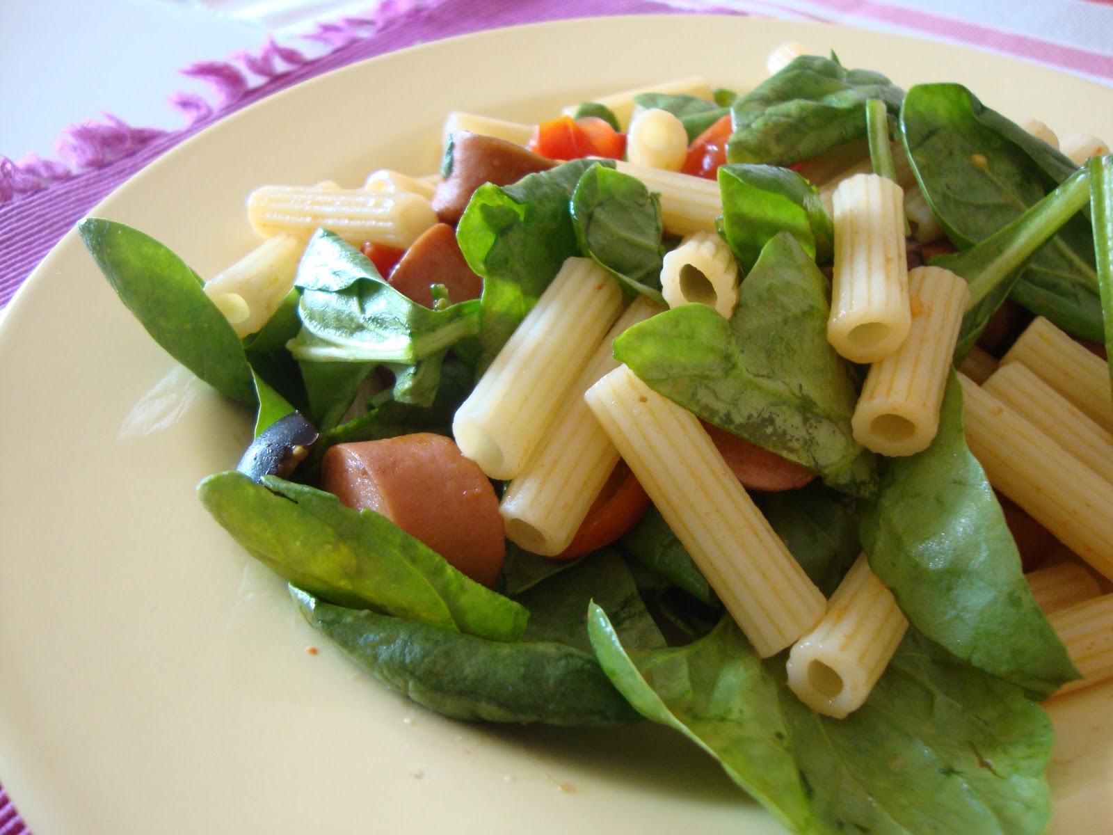 Salada Quente de Massa com Salsichas e Azeitonas