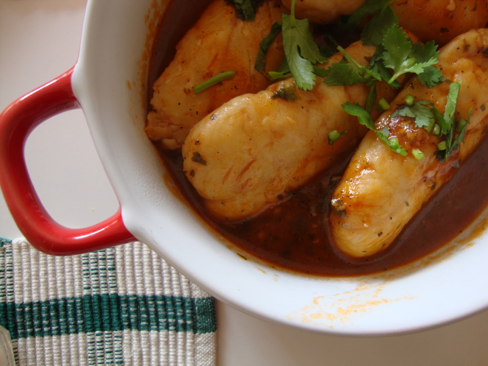 Deixe cozinhar durante o peixe estar no ponto e o molho reduzido. Sirva polvilhado com coentros picados e sirva com umas batatinhas cozidas ou arroz e uns brócolos.