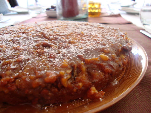 Quando o bolo estiver cozido retire do forno e desenforme-o ainda morno para o prato de servir. Verta depois a cobertura sobre o bolo.