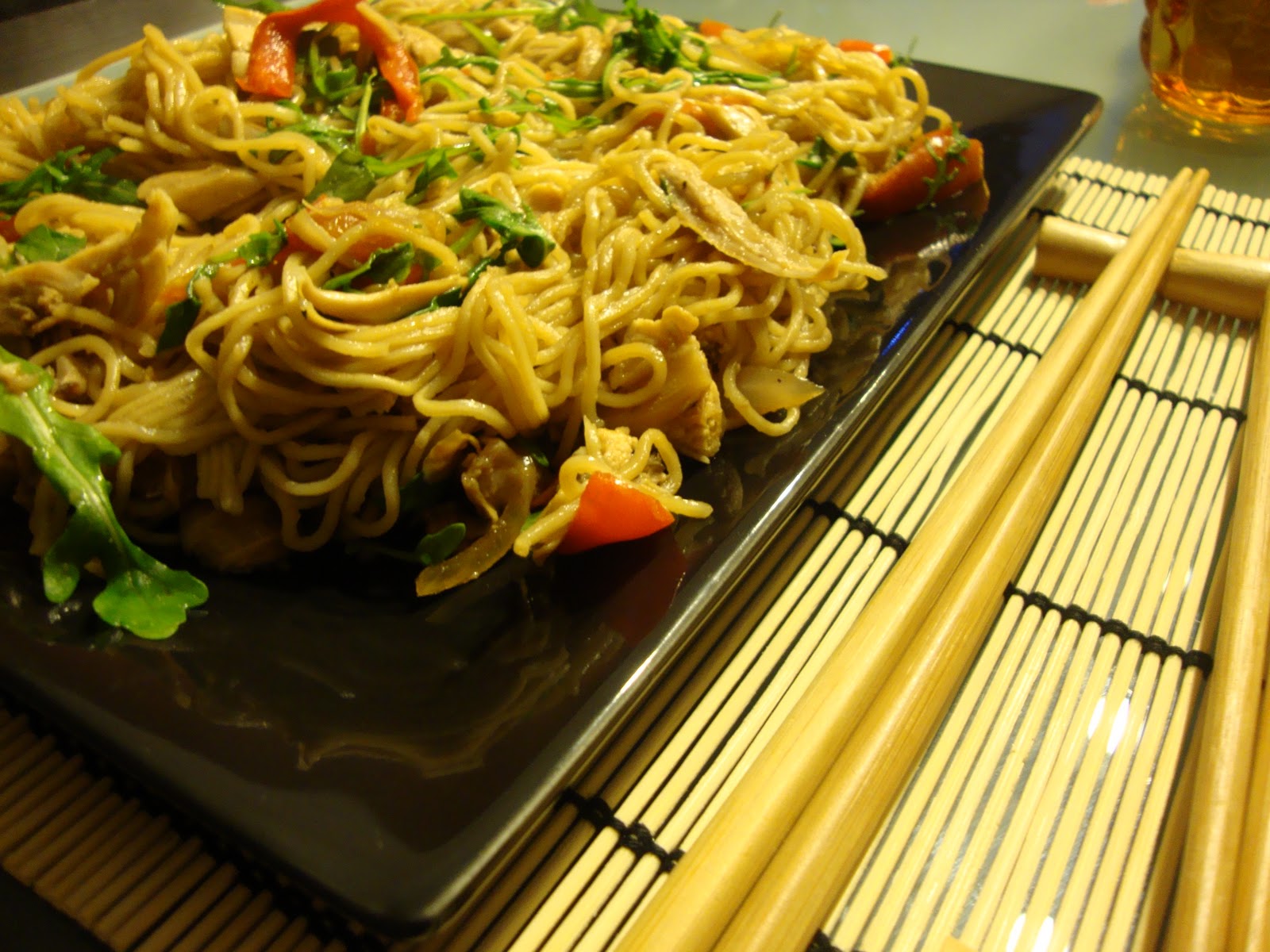 Uma versão de massa chinesa (noodles) que adaptei consoante o que tinha em casa e que aproveitei para dar uso a umas sobras de frango assado.