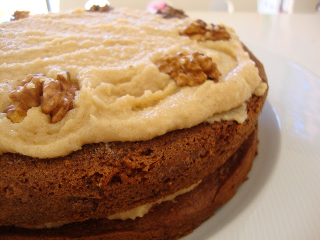 Já quase em desespero, recorri mais uma vez ao Nigella Kitchen - onde já tinha ido buscar a receita do meu bolo de aniversário - e de repende ali estava o bolo ideal. Foi fácil de perceber que só podia ser aquele: bolo de café e noz com uma cobertura de manteiga, açúcar e café, tal e qual o bolo de bolacha que é o preferido do meu pai. Não tivesse eu sido trapalhona (a preguiça apoderou-se de mim e em vez de ir ao supermercado comprar mais uma embalagem de açúcar em pó para a cobertura, dei comigo a substituir o resto da quantidade pedida por açúcar normal. Claro que a cobertura não ficou aveludada e sentiam-se os os grão de açúcar nos dentes: nada agradável!) e o bolo teria sido ainda um maior sucesso!