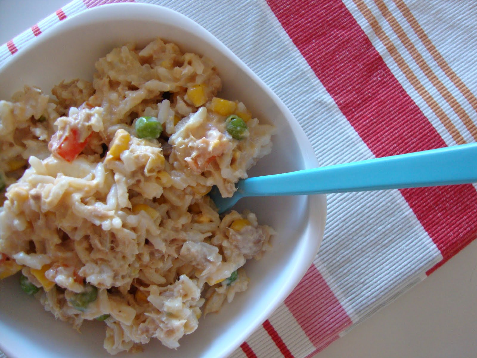 Numa saladeira junte o arroz, o atum previamente escorrido, o milho doce e o tomate sem pele nem sementes e cortado em cubinhos. Acrescente a mistura de cenoura e ervilhas e os ovos já descascados e cortados em rodelas. Misture bem.