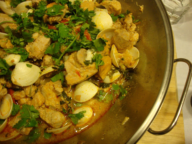 Com cuidado, abra depois a cataplana e acrescente as ameijoas e metade dos coentros picados. Deixe cozinhar mais uns minutos até as ameijoas terem aberto.