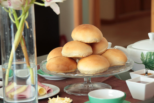 Sirva os pãezinhos mornos com compotas, manteiga ou queijo e fiambre.