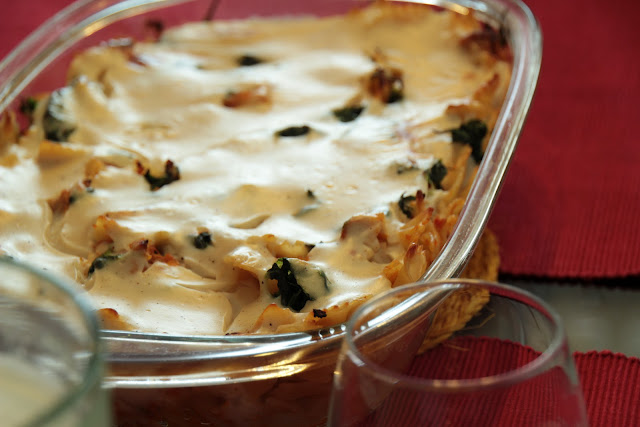 Coloque a mistura num tabuleiro que vá ao forno e à mesa e cubra com o molho bechámel.
