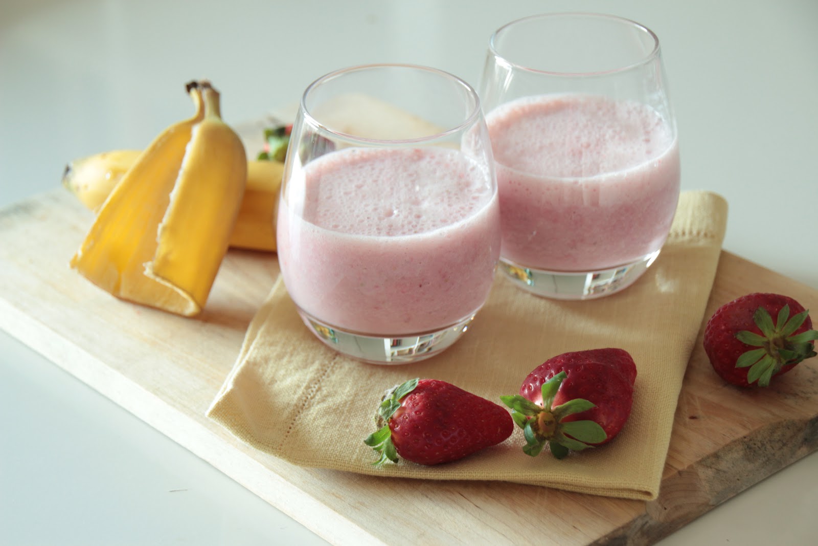Lave os morangos, retire-lhes os pezinhos e corte-os ao meio. Descasque a banana e corte-as em rodelas. Coloque a fruta num copo alto, junte o leite e se necessário o açúcar, e bata com a varinha mágica até obter um batido cremoso e com espuma.