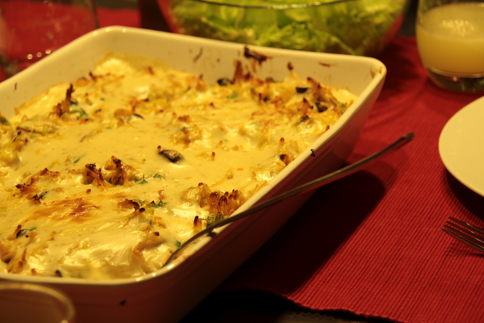 Cubra tudo com o molho bechámel e leve ao forno quente (180ºC) a gratinar!