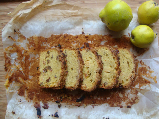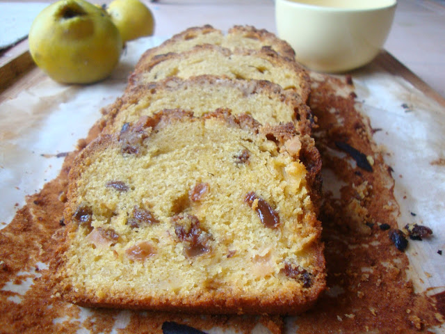 Coloque a mistura numa taça e junte as passas, os ovos previamente batidos com o leite e os marmelos previamente descascados e cortados em cubinhos. Misture bem e coloque numa forma de bolo inglês previamente untada com manteiga e forrada com papel vegetal.