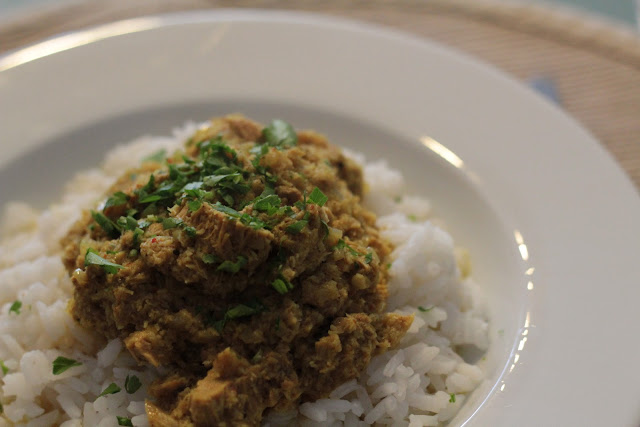 Sirva o caril de atum com arroz branco e polvilhado com os coentros frescos picados.