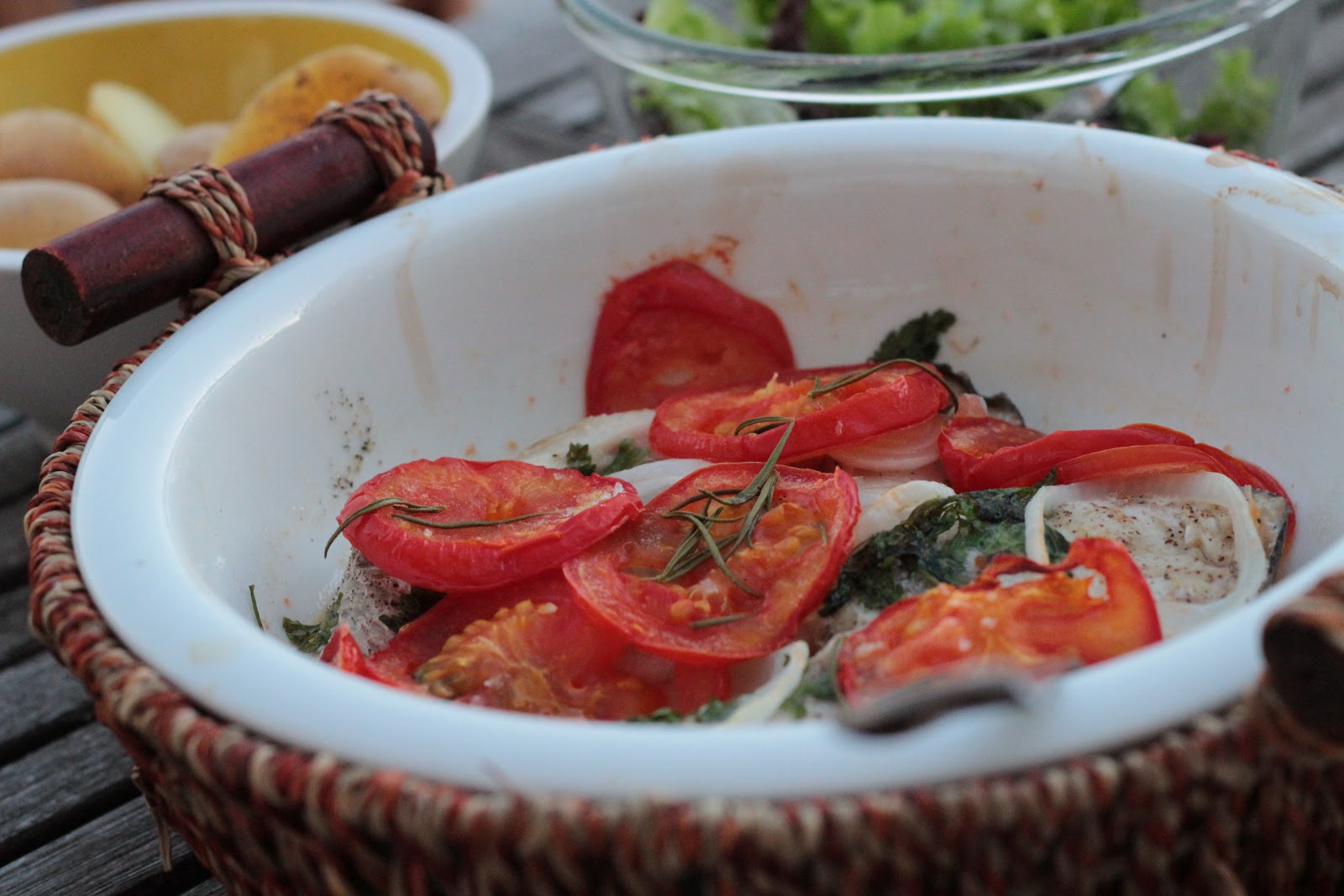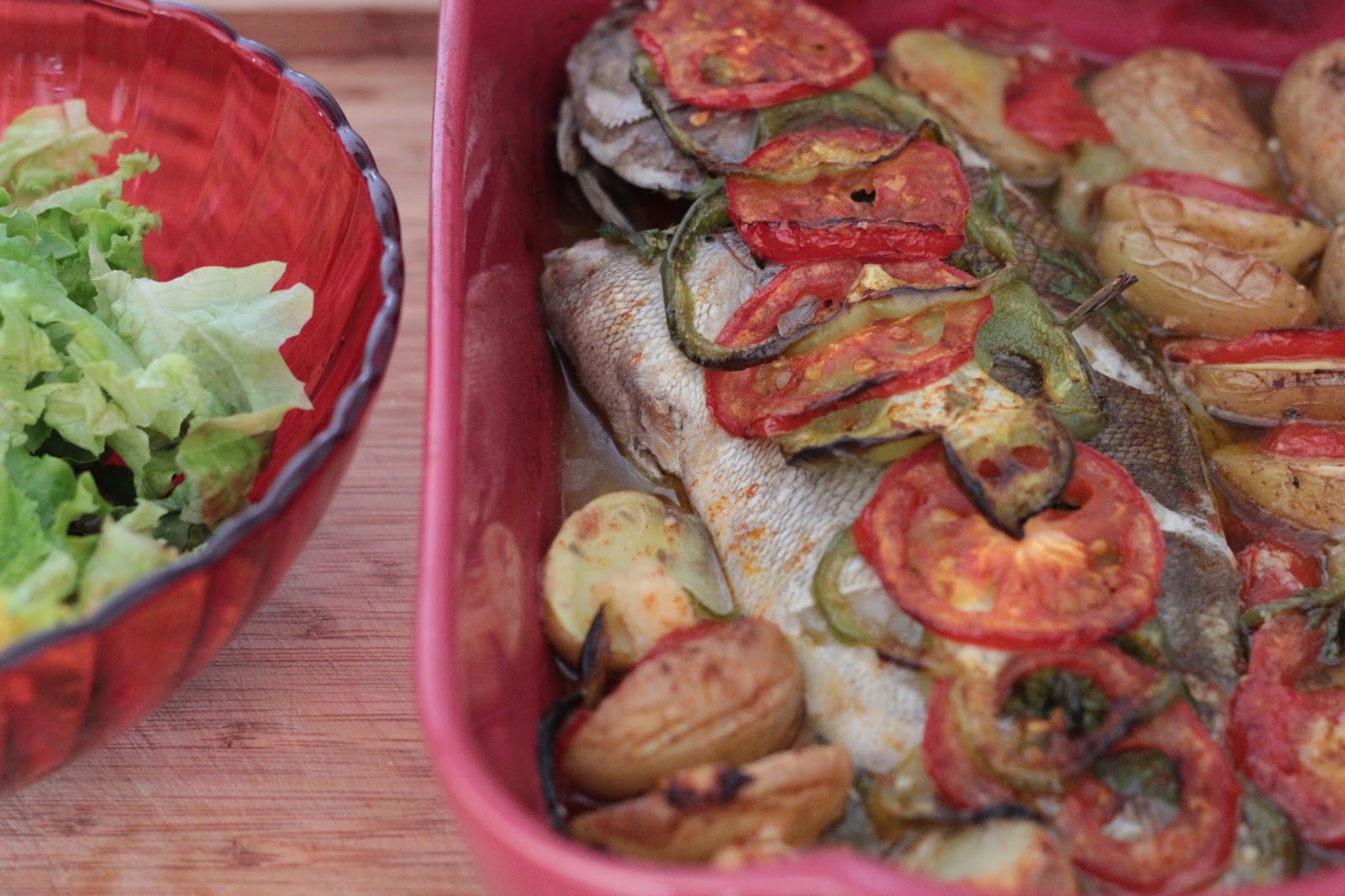 Desta vez um peixe no forno, muito saboroso, e com as cores da bandeira de Portugal, neste feriado do 10 de Junho. Peixe, pimento e tomate, coisas que nunca faltam nas minhas férias e que me sabem sempre a férias.