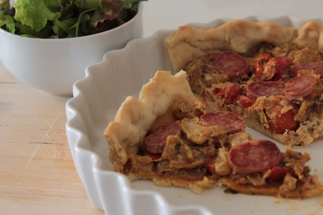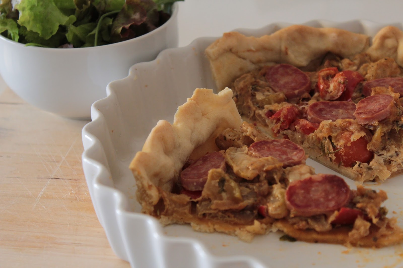Espalhe o recheio de legumes pela base da tarte e polvilhe com o queijo da serra ralado. Cubra com umas rodelinhas de chouriço e leve novamente ao forno (180ºC) para gratinar os queijos e dourar o chouriço, cerca de 10/15 minutos