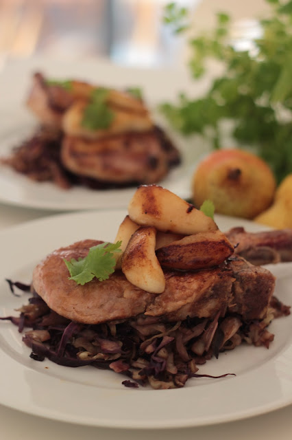 Costeletas de Porco com Peras Caramelizadas e Couve Salteada