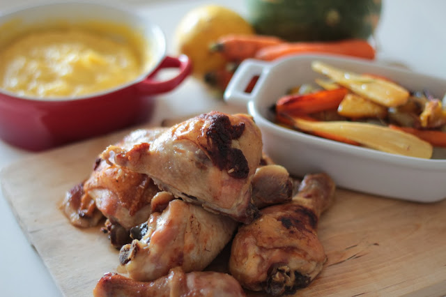 Frango Assado com Legumes de Outono e Puré de Batata e Abóbora