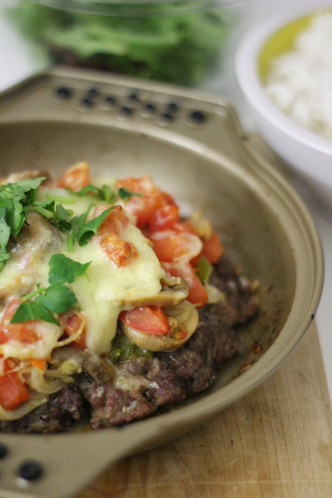 Retire o hambúrguer do forno e cubra-o com esta mistura de legumes. Cubra com o queijo ralado e leve novamente ao forno cerca de 10 minutos até o queijo derreter e dourar ligeiramente.