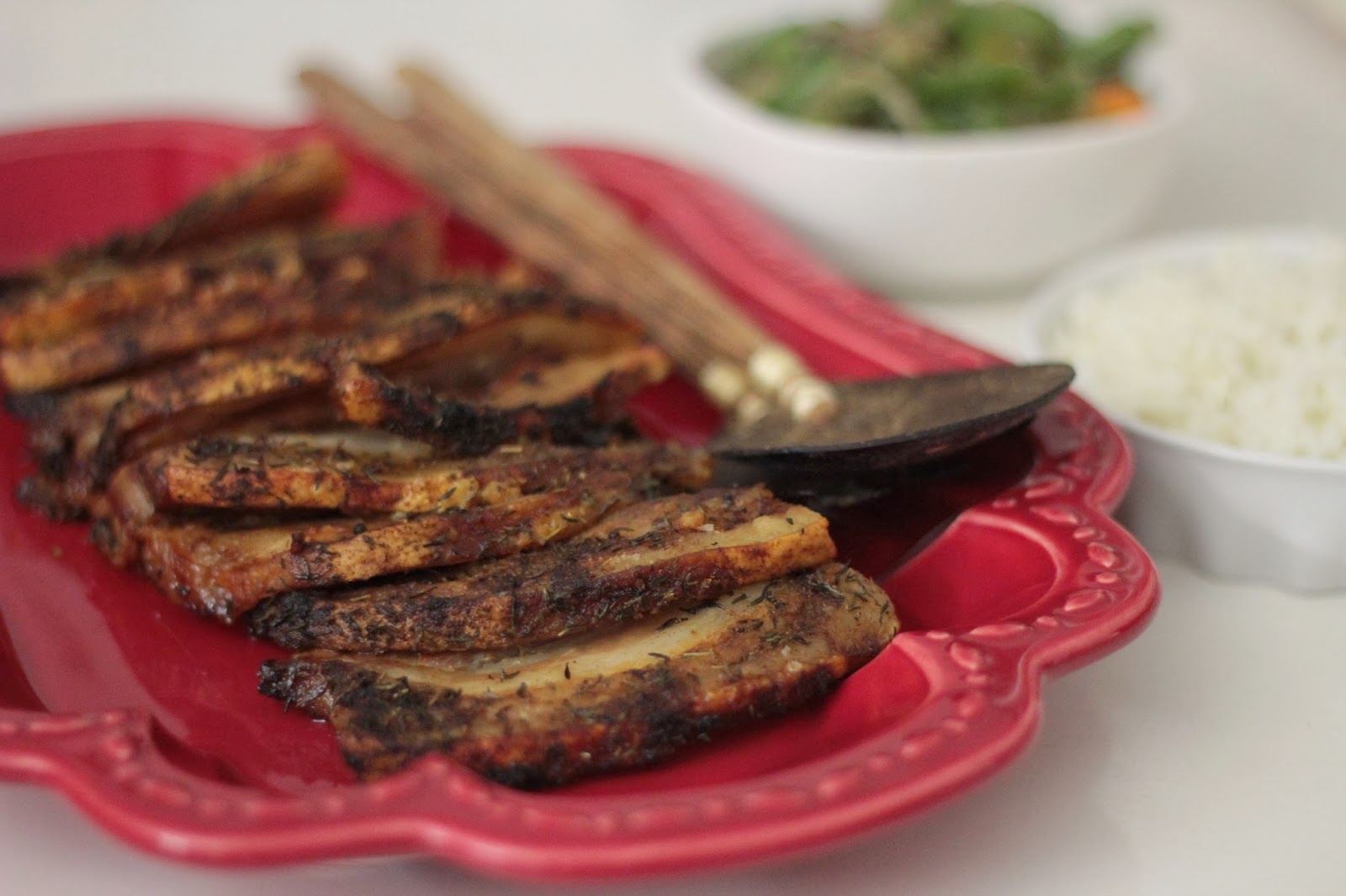 Para começar saiu esta entremeada assada no forno. Tradicionalmente estamos mais habituados a grelhá-la na brasa nos churrasco de verão, mas esta é uma carne perfeita para assar lentamente no forno. Com a cozedura lenta vai libertando a gordura e tostando a pele que, para quem gosta é um verdadeiro petisco crocante (o “crackling” que o júri do Masterchef Australia tanto gosta!)