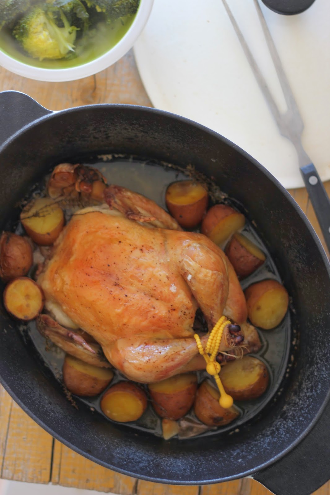 Sirva o frango partido em pedaços, com as batatas e os sucos do tacho, com uma salada verde ou legumes cozidos.
