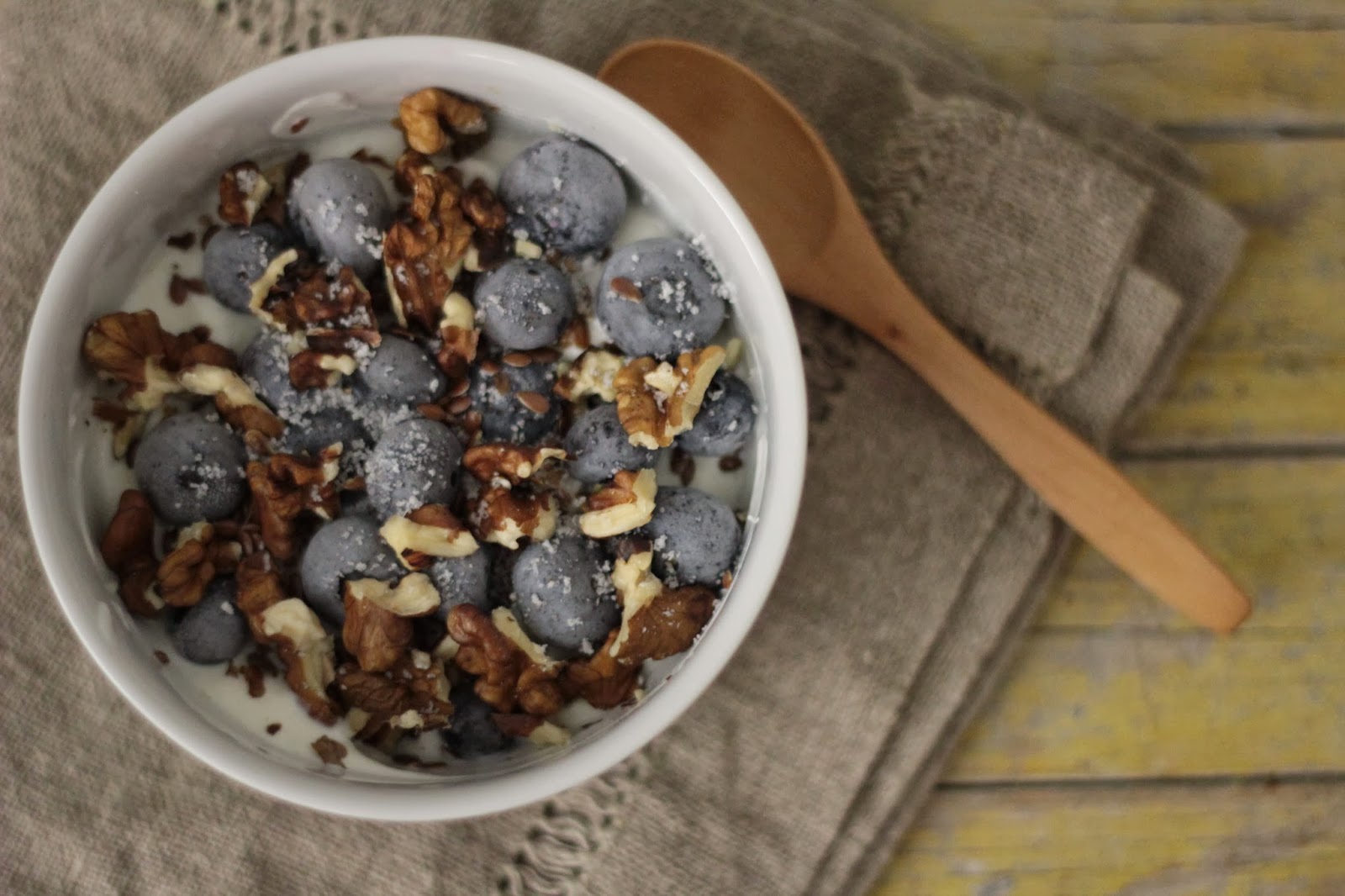 No fundo de uma taça coloque o iogurte grego. Por cima disponha as nozes e os mirtilos e polvilhe com as sementes de linhaça.