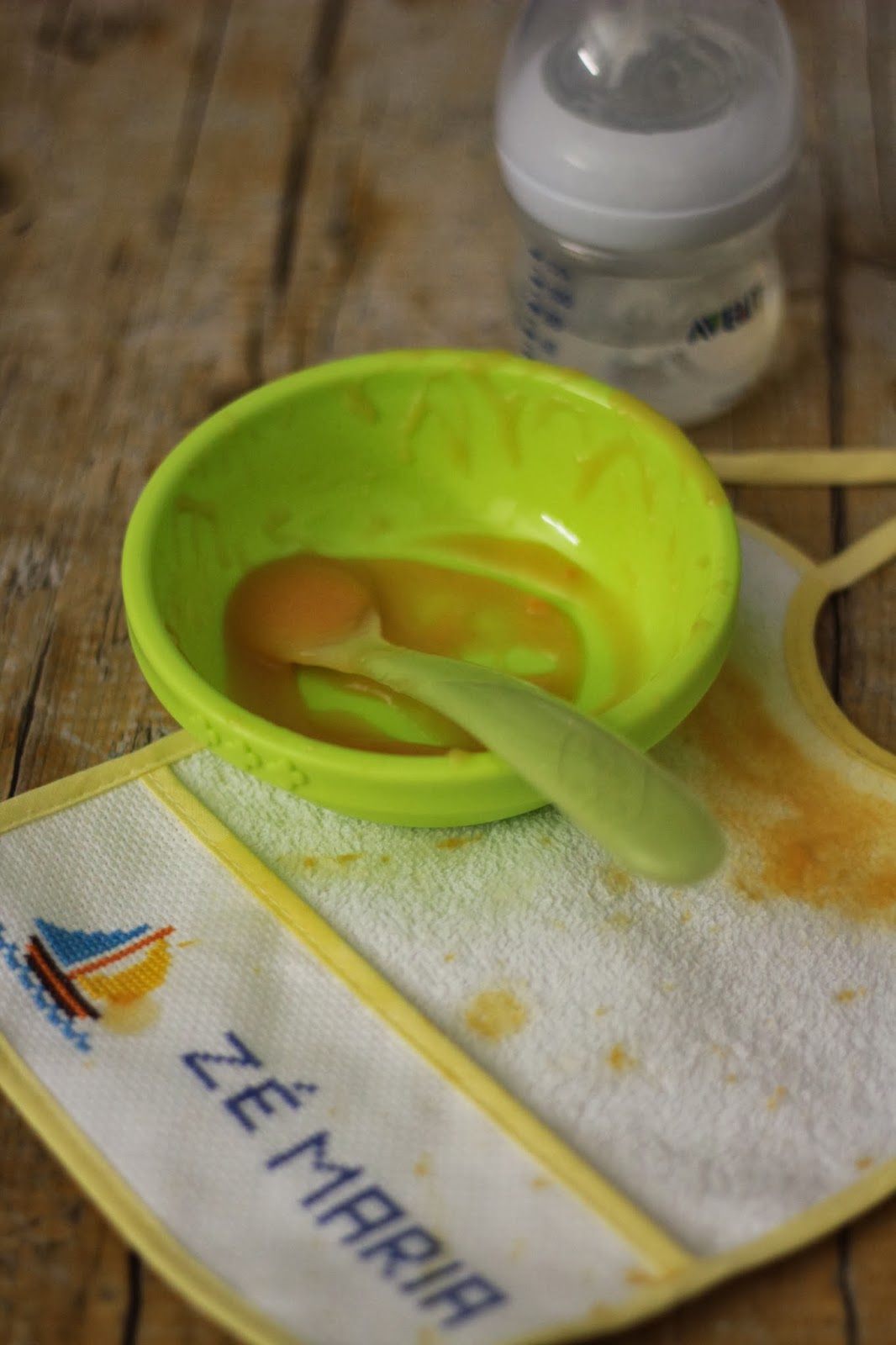 Por isso não podia deixar em branco a primeira sopa do Zé Maria. Aos 5 meses e 4 dias preparei a receita mais simples de todas, mas a que me deu o maior prazer de preparar. A primeira receita que cozinhei para o meu amor pequenino comer. É um marco para mim e para ele e achei que merecia ser partilhada. Esse momento que esperamos com um misto de ansiedade e de medo. Começar a comer sopinhas significa que está a crescer. Já não é o meu bebé pequenino que nasceu com 2630kg e 45cm. Já ri, muito. Já refila, pouco. Já espalha a água toda do banho. Já não treme de frio de cada vez que o despimos. Já dá sinal de que a fralda está suja ou que quer ir dormir.
