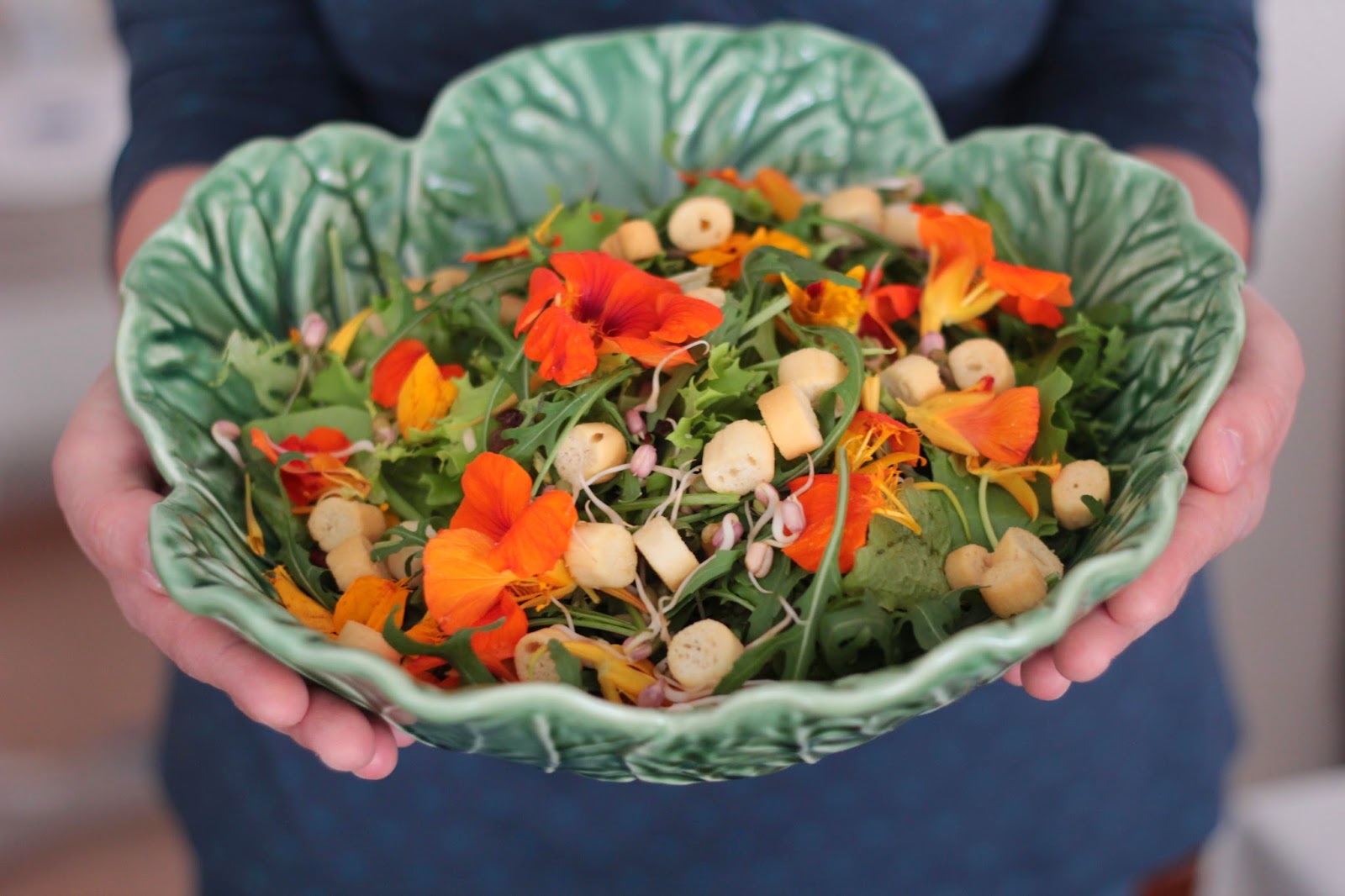 Coloque depois a mistura de saladas num saladeira e polvilhe depois com as sementes, as passas, as nozes, os croutons e os rebentos de feijão mungo. Decore com as flores comestíveis e mesmo antes de servir tempere a gosto com uma vinagreta simples.