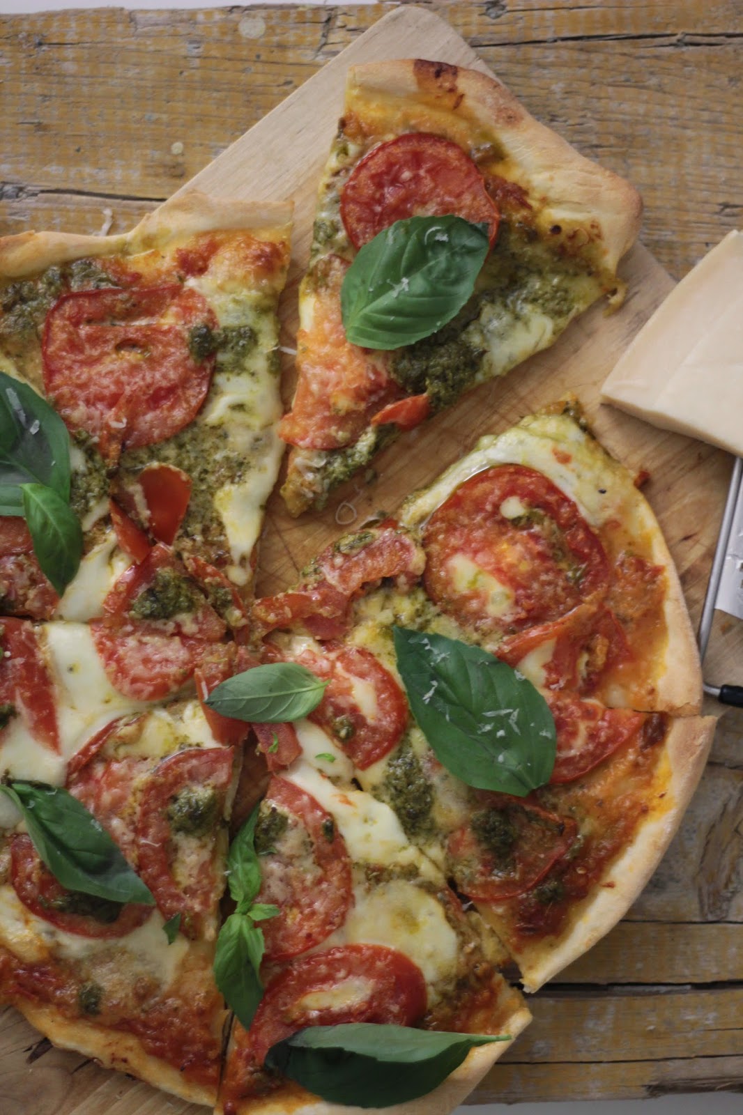 Corte o tomate em fatias assim como a mozarela fresca e disponha-as sobre a base de pizza. Cubra depois tudo com o parmesão ralado na hora e disponha o restante pesto, em montinhos, sobre a pizza.