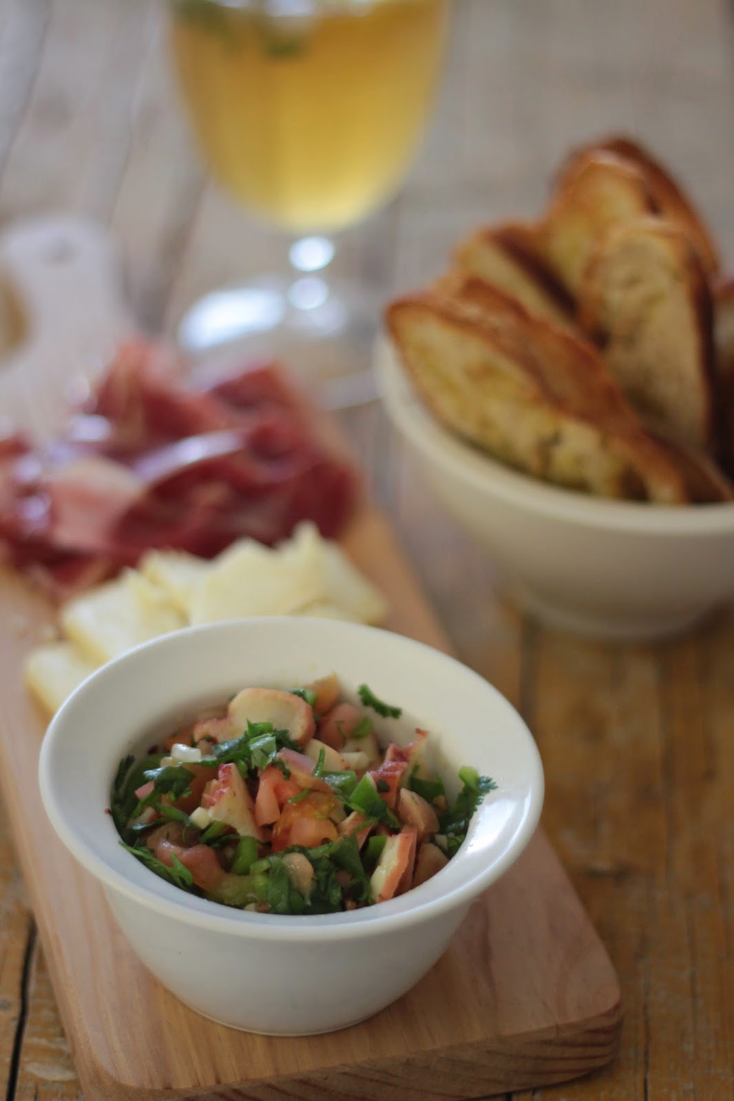 Já em casa, com os ingredientes desejados, lembrei-me de que tinha no frigorifico um resto de polvo cozido. Por isso saiu mais um petisco para a nossa mesa, uma saladinha de polvo que acompanhei com umas torradas fininhas de pão alentejano. Afinal, tudo o que é petisco é comida para ver jogos de futebol.