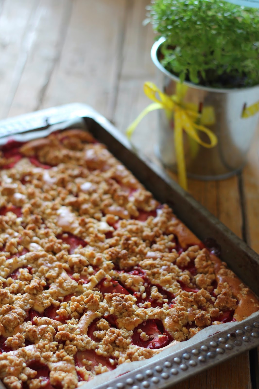 Um bolo pouco doce, perfeito para lanches, chá ou até para pequeno almoço, para quem gosta de começar o dia de forma mais gulosa. Um bolo com morangos, mas cuja receita original levava alperces. Uma sugestão deliciosa para preparar com qualquer fruta de verão que tenham em casa. Parece-me que também deve ficar delicioso com uma combinação de pêssego e framboesas, ou com ameixas, ou ainda com figos…. Alternativas, muitas alternativas.